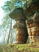 Hier überqueren wir die Straße und kommen zum Nordwestteil des Felsenweges. Zunächst geht es auf breiterem Weg (Plapperzeit!), dann wieder auf Pfaden am Zigeunerfels, Maibrunnenfelsen und Kanzelfelsen vorbei. In einer großen Schleife umgehen wir das Lindersbachtal mit den Rodalber Sportanlagen, überqueren die zum Höhendorf Clausen führende Straße und kommen zum für große Besucherzahlen ausgelegten Hilschberghaus. Fast durchgängig auf Pfaden wandern wir am Saufelsen und am Rappenkopffelsen vorbei (unter uns liegen die Ortsteile Lohn und Heide) und wenden uns dann nach Norden, um das größte Seitental, das Clauser Tal zu umrunden. Dies ist das stillste und ursprünglichste Teilstück des Weges; wir passieren dabei den Klausfelsen, den im Talschluss gelegenen mächtigen Kuhfelsen, das Eisenbörnchen und den Fuchsfelsen. Beim Wanderparkplatz Hirschbrunnen überschreiten wir die Rodalbe und gehen den langen Südostabschnitt des Felsenweges an. Am Ortsteil Neuhof entlang (wir wundern uns angesichts der vielen Wildschweinspuren, wie nahe das Schwarzwild an die Häuser herangeht) kommen wir aufsteigend zum Felsen am Hohen Kopf und zur filmreifen Kulisse des Karl-May-Felsens. Der Pfad umgeht das Hungerpfuhltal und das Gemerstal und erreicht am Geißbühlkopf einen der seltenen Aussichtpunkte. Der Seibelsbachfelsen und die Sommerwaldquelle über dem (nomen est omen) Langenbachtal sind die nächsten Stationen, bevor wir mit dem Bärenfelsen, der größten Sandsteinhöhle der Pfalz, einen würdigen letzten Höhepunkt erreichen. Wer Lust auf einen Tourenausklang im Tal hat, verlässt hier die F-Markierung, geht ein paar Schritte hinunter zum Kleinen Bärenfelsen und durch das Langental Richtung Rodalben. Vor den ersten Häusern links hinauf und wir finden wieder den Anschluss an den Felsenwanderweg. Den verlassen wir an der Pirmasenser Straße unterhalb des Bruderfelsens, um zum Bahnhof hinunter zu schlendern. Variante: