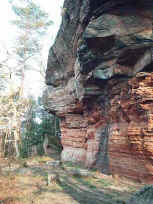 Auf dem Rotenstein (422 m) erleben wir ein Wasgau-Panorama, das bis über die Wegelnburg im Süden hinausreicht. Der Aussichtspunkt - mit einer gemauerte Schutzhütte - liegt auf einem Felsen, von dessen mächtigen Überhängen wir hier noch nichts ahnen. Die sehen wir dann beim Abstieg über einen steilen Bergpfad. Er geht in einen breiten Weg über, der zunächst eine Hochebene mit lichtem Baumbestand überquert und dann steil in das Waschtal hinunterführt. Dieses wird am Annaweiher (240 m) erreicht, einem verwunschenen Gewässer, an dem man häufig Nutrias beobachten kann. Auf einem asphaltierten Sträßchen geht es nun talaufwärts durch das Waschtal. Wir passieren einige Fischweiher, wechseln dann die Talseite und kommen so entlang der Bahnstrecke Saarbrücken-Landau zu einem ehemaligen Bahnwärterhäuschen, das heute von einer Jugendorganisation genutzt wird. Neben einem Bahntunnel geht es letztmals etwas bergauf und dann leicht abwärts zu dem Sträßchen, an dem unser Auto steht. Variante