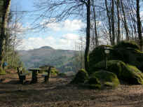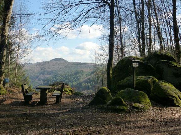 Zwischen den Bäumen hindurch sehen wir jetzt rechterhand die beiden Hauptziele der Tour, den Bauwalder Kopf und den Rotenstein. Auf dem nordwärts ausgerichteten Bergrücken folgen wir nun einem Forstweg [ohne Markierung], der nach einer guten Viertelstunde auf den "Münchweiler Höhenwanderweg" stößt, der jetzt weitgehend die Route vorgeben wird [beschildert]. Wir biegen also scharf rechts ab und kommen so in einem großen Bogen in die Südflanke des Bauwalder Kopfes, welcher einen hervorragenden Aussichtspunkt zu bieten hat.