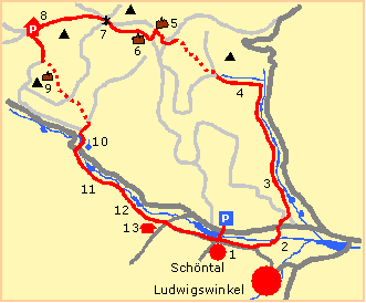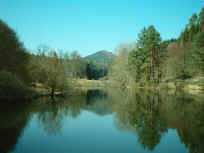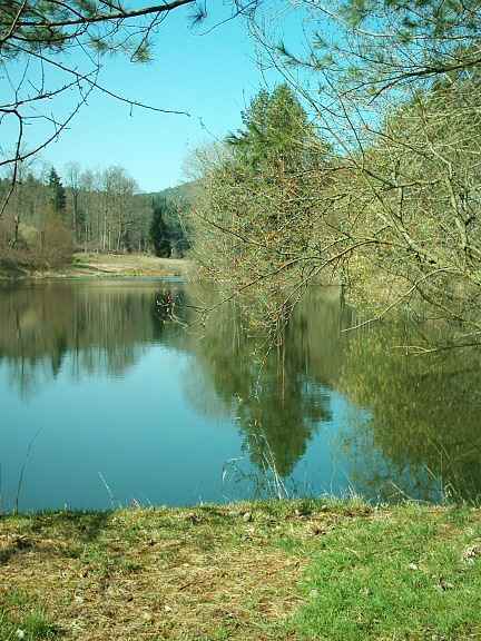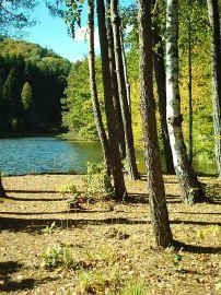 Wie überall gelten auch beim Wandern ungeschriebene Gesetze. Eines davon lautet: Man bringe sich möglichst schnell außer Sicht- und Hörweite von befahrenen Straßen. Dieser Tourentipp im dünn besiedelten südwestlichen Pfälzerwald allerdings spielt mit der Lust am Regelverstoß, denn wir nutzen zwei Täler mit Autoverkehr: Das Fauner Tal und das Reißler Tal. Die Schönheit dieser wasserreichen Tallandschaften und die Tatsache, dass wir uns fast immer auf der straßenfreien Talseite bewegen, addiert zu den Wonnen der Regelverletzung die eines ungewöhnlichen Naturgenusses. Unser Ausgangspunkt ist - zumindest an einem unbelebten Vormittag im Sommer - verführerisch: Der Schöntalweiher (auch als "Lagerweiher" bekannt) im Tal des Saarbaches mit seinem friedlichen Moorwasser und seiner angenehmen Liegewiese legt einen faulen Badetag nahe. Kein Wunder, wenn wir schwer in die Gänge kommen (die Badefreuden waren in den letzten Jahren allerdings häufiger durch ein „Wasserpest“ genanntes Wassergewächs getrübt). Die Willensstarken also überqueren den Damm und halten sich dann links, um auf einem Fahrradweg an den Häusern des Ludwigswinkler Ortsteils Schöntal vorbei bis zu einer ausgeprägten Rechtskurve zu laufen. Hier geht es geradeaus weiter [Schild "Horbachkanzel", bis Straßenüberquerung] und dann links auf einem alten Alleeweg quer über das Saarbachtal auf die nördliche Talseite, wo die Straße zwischen Fischbach und Eppenbrunn überquert wird. Rechtshaltend führt ein ebener Waldweg in das von Norden herabziehende Fauner Tal. Hier verläuft die einsame Straße zwischen Fischbach und Salzwoog, eine der längsten deutschen Waldstraßen. Wir nutzen talaufwärts eine alte Handelsstraße auf der linken Talseite, von der noch gut erhaltene Pflasterreste aus dem heimischen Buntsandstein zeugen. Fischweiher reiht sich hier an Fischweiher; es gibt allerlei Wassergetier zu beobachten.