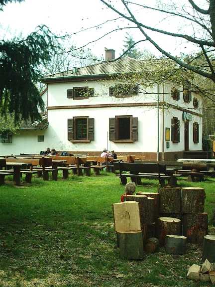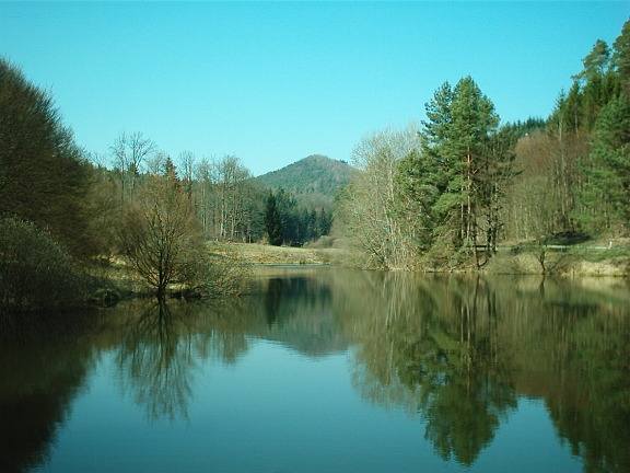 Eine knappe halbe Stunde brauchen wir jetzt noch, um über die große Wegspinne Acht Wege zwischen den Bergen Hohe List und Hoher Kopf zum am Wochenende bewirtschafteten Waldhaus Hohe List des Pfälzerwald-Vereins (420 m) zu laufen. Drinnen ist's eng und gemütlich, draußen gibt es eine Menge Freisitzplätze. Hinter dem Waldhaus wenden wir uns nach links und laufen auf einem Höhenweg südwärts [Rotes Logo der "Hohe-List-Tour"]. Daran schließt sich ein Bilderbuch-Pfad an, der am markanten Felseneck vorbei und durch eine Felstrümmer-Landschaft bergab führt. Kurz noch durch ein vom Zigeunerfelsen kommendes Tälchen mit dem ausgetrockneten "Steinigen Bach" und wir sind im Reißler Tal (255 m). Am Wegesrand liegt der mit einem Ritterstein markierte Saarbrunnen, der Ursprung des Saarbachs, welcher über Fischbach und Schönau ins Elsass fließt (und dann Sauer heißt). Die Straße, die wir jetzt überqueren, ist Motorsportfans als Eselsteige ein Begriff: Hier fanden bis in die Siebziger Jahre berühmt-berüchtigte Bergrennen statt, deren Höllengetöse bis nach Pirmasens zu hören war. Am Saarbach entlang streifen wir nun talabwärts, genießen die herrliche Pflanzenwelt dieser Talauen und kommen bald zu einem malerischen Weiher, dem Mümmelsee (Bild oben). Hier beginnt eine der schönsten und eigenwilligsten Tallandschaften der Pfalz, die grasige Ebene um den Reißlerhof, ein früheres Bauerngehöft. Auf einem Fahrweg bummeln wir dann weiter zum Schöntalweiher. Zeit, sich die Wanderklamotten vom Leib zu reißen und ins samtige Wasser einzutauchen! Winterwanderer genießen die Stille und beobachten Schwäne. Benachbarte