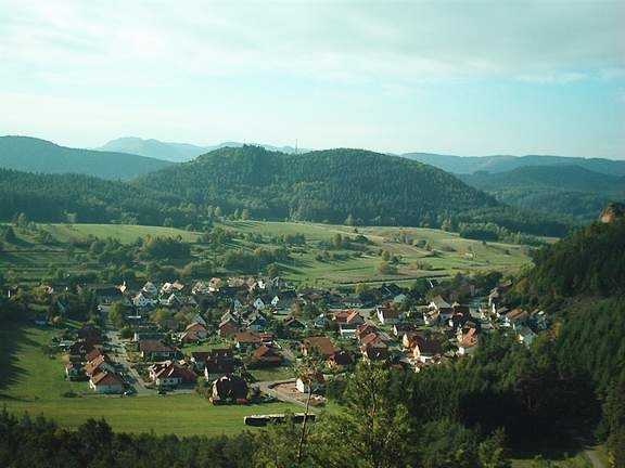 Blick frei nach Norden zur Dahner Burgengruppe, nach Erfweiler mit dem