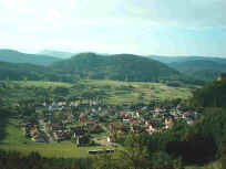 Kuckucksfelsen zur Rechten hinunter zum östlichen Ortsrand von Schindhard