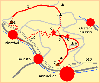 Straße zwischen Sarnstall und Rinnthal zu gelangen. Dort halten wir uns rechts