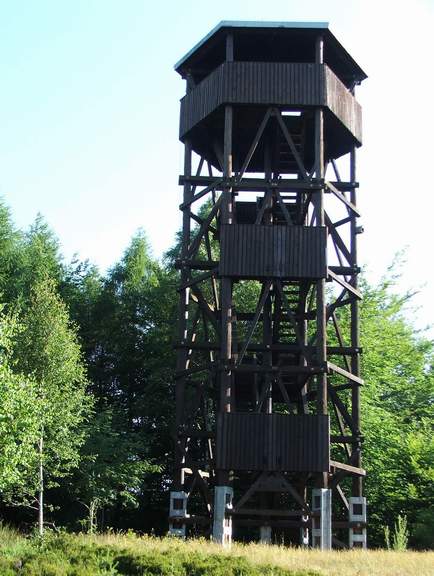 (571 m) leicht zu übersehen ist. Wegen Baufälligkeit war der erst 1975 errichtete Turm eine Zeit lang gesperrt; nach umfassender Sanierung ist er seit 2004 wieder zugänglich. 65 Stufen führen zur regensicher überdachten Aussichtsplattform, von der man den Pfälzerwald