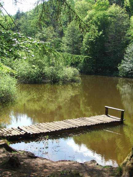 Am Naturfreundehaus Gersbachtal nehmen wir statt eines Asphaltsträßchens natürlich gleich den Wanderweg auf der anderen Talseite. An üppigen Erlen vorbei kommen wir so zum Gersbachtalweiher, hinter dem sich der mehrfach gestufte Teufelsfelsen erhebt. Unbedingt genauer anschauen! Weiter auf der linken Talseite erreichen wir einen zweiten Weiher; dort wechseln wir auf die andere Seite des jetzt von mächtige Fichten geprägten Tales und wandern auf einem Forstweg weiter. Hinter einer auffälligen Linkskurve zweigt rechts ein Pfad ab [Roter Punkt, bis Hochstellerhof], der uns steil bergauf zum kleinen Höhendorf Hochstellerhof (430 m) bringt.
