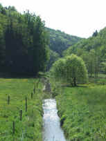 Dort überqueren wir abermals die Durchgangsstraße und laufen  geradeaus hinunter in die Hauptstraße. Hinter zwei Kirchen liegt der Dorfbrunnen, wo der Weg hinunter ins Felsalbtal beginnt [Schild "Eichelsbacher Mühle"]. Der von Birken gesäumte Weg durch das Vinninger Tal mit seinen Schaf- und Rinderweiden ist eine der schönsten Passagen unserer Tour. Unten im Talgrund gehen wir nach links auf die andere Talseite und etwa 100 m entlang einer Straße zur Eichelsbacher Mühle (266 m) im Felsalbtal. Genau der richtige Zeitpunkt für eine Einkehr!