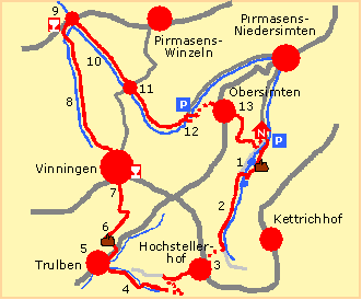 Route (19 km): Naturfreundehaus Gersbachtal - 1 Gersbachtalweiher (Teufelsfelsen) - 2 Gersbachtal - 3 Hochstellerhof - 4 Ungertal - 5 Trulben - 6 Krappenfels (über dem Finsterbachtal) - 7 Vinningen - 8 Vinninger Tal - 9 Eichelsbacher Mühle - 10 Felsalbtal - 11 Schelermühle - 12 Rehmühle - 13 Obersimten - Naturfreundehaus Gersbachtal