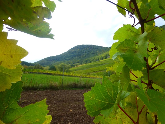 durch die Weinberge auf die Berge zu. Links liegt die Burgruine