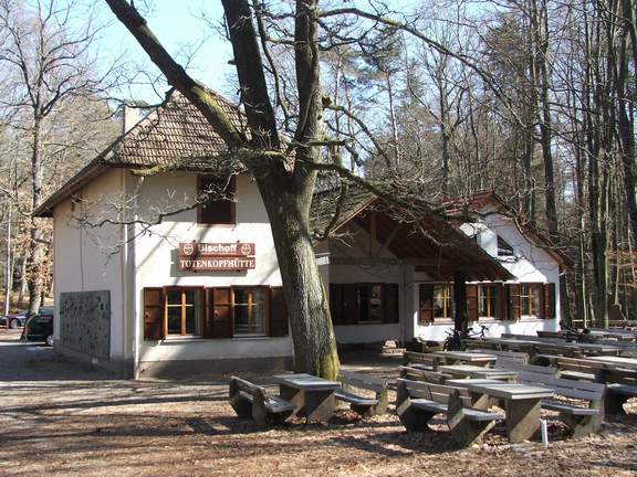 Balken, bis Erfenstein] zur Totenkopfhütte des Pfälzerwald-Vereins (515 m), einem Wanderer-, Biker und Autofahrertreffpunkt, den massensensible Gemüter sonntags eher meiden.