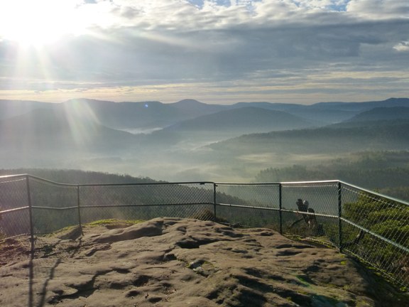 Pfälzerwaldes. Durch ein Geländer geschützt stehen wir 55 Meter über dem Fuß