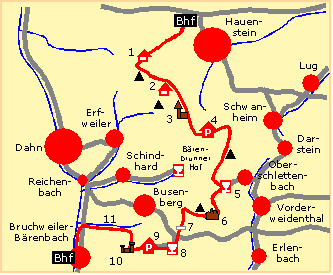 großzügige Nord-Süd-Wanderung. Die Route verbindet mehrere Premiumwege, von denen jeweils Teilstücke genutzt werden. Zwei Hütten des Pfälzerwald-Vereins und