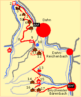 etwa 200 m Richtung Dahn, um dann scharf rechts auf einem Pfädchen zu einem