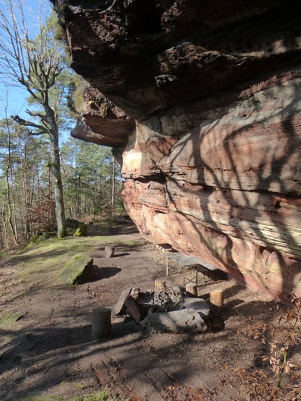 Im Schutz seines weit überhängenden Felsdachs liegt eine Feuerstelle mit zwei