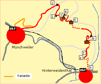 absteigen und durch dieses parallel zur Bahnlinie nach Münchweiler)
