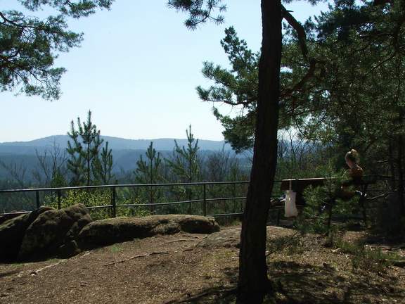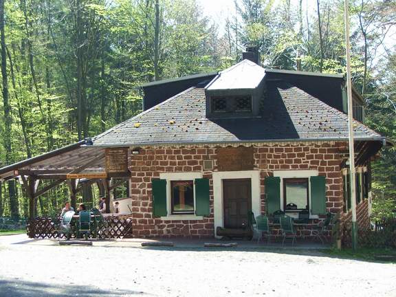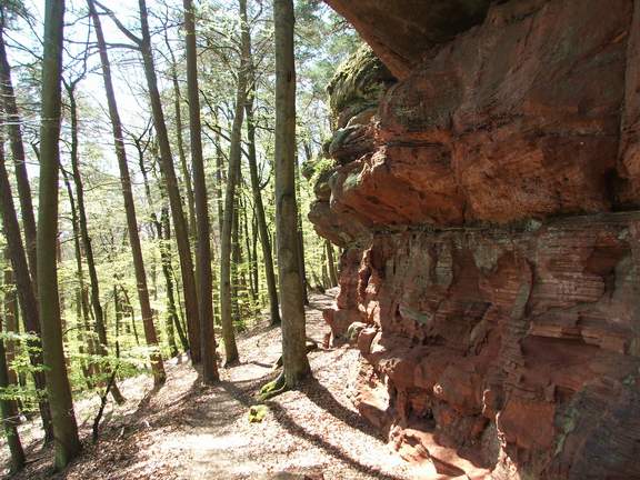 Kurz nach dem Start an einer Orientierungstafel stehen wir schon unter den Rothenbergfelsen und bestaunen die Wunder des pfälzischen Buntsandsteins: Kamine, Risse, Überhänge, Bänder und Höhlen in rostbraunen Farbtönen. Unterhalb der Felsen führt ein windungsreicher Pfad zur Schutzhütte Schönhälschen. Über Keimskreuz, wo einst ein Forstmann von einem Wilderer erschossen wurde, erreichen wir auf einem fast ebenen Weg das am Wochenende bewirtschaftete Waldhaus Drei Buchen.