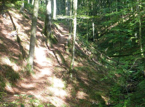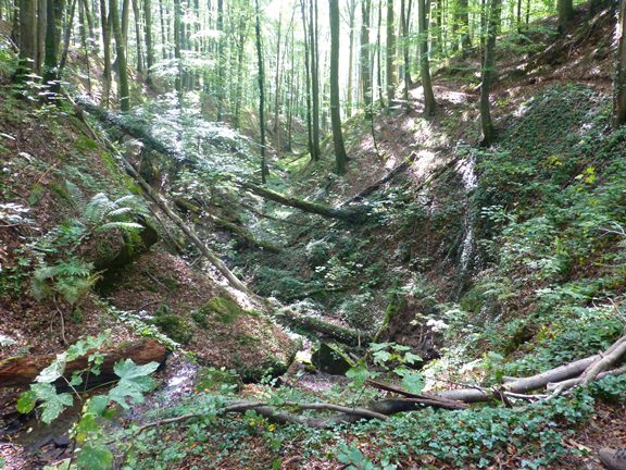 hier ein Wasserlauf tief in den Harschberg eingefressen, im oberen Teil durch