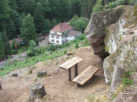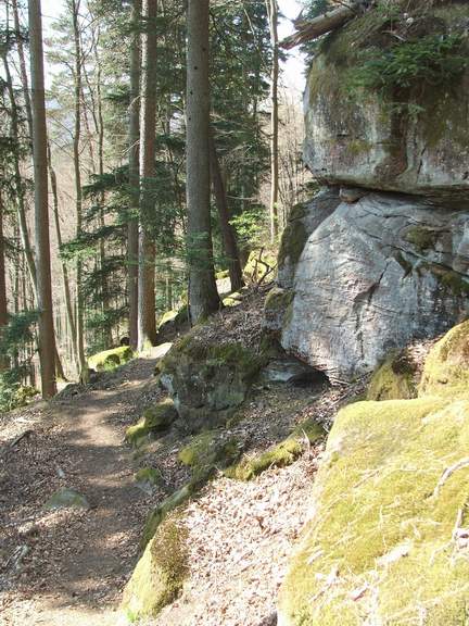 Felsenwanderweges mit seinen zahlreichen Buntsandstein-Felsen, dann durch