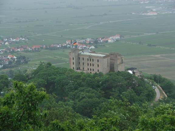Im Trifels und im Hambacher Schloss konzentriert sich das pfälzische Geschichtsbewusstsein. Beide gehen auf das Herrschergeschlecht der Staufer zurück; der Trifels steht für mittelalterliche Burgenromantik und die Politik des Heiligen Römischen Reiches Deutscher Nation, das Hambacher Schloss für die erbitterten Auseinandersetzungen um die Demokratisierung Deutschlands. 1832 demonstrierten beim "Hambacher Fest" 30000 Menschen aus ganz Deutschland für die Freiheit und Einheit des zersplitterten Deutschlands und bescheidene demokratische Freiheiten. 1842 wurde die Ruine dem bayerischen Kronprinzen Maximilian geschenkt, wodurch der alternative Name Maxburg enstand. Von der alten Burg sind die Ringmauer mit Türmen und die mächtige Schildmauer erhalten; nach umfangreichem Ausbau ist die Burg heute Schauplatz repräsentativer Veranstaltungen. Der Zugang ist nur im Rahmen von Führungen möglich. Der ursprüngliche Name des Hambacher Schlosses, Kestenburg ("Kastanienburg") lässt auf die Wälder der Umgebung schließen. Wer welche finden will, muss sich allerdings früh aufmachen - die Sammlerkonkurrenz ist groß. Variante 1 (vom Burgenparkplatz, 40-50 min): Wenige Meter zu Fuß. Variante 2 (vom Bergfuß durch Weinberge und Wald, 70-80 min): An den letzten Häusern vor dem Beginn des Haardtgebirges beginnt ein markierter Wanderweg, der zunächst noch kurz durch die Weinberge und dann durch den Kastanienwald zum die Weinstraßen-Szenerie dominierenden Hambacher Schloss führt. Insgesamt sind 120 Höhenmeter aufzusteigen. In