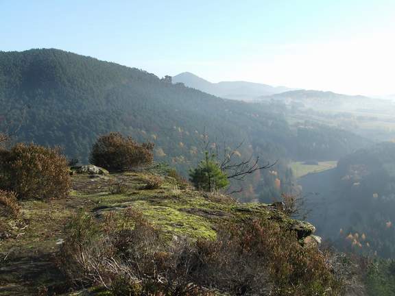 Der 355 m hohe Nesselberg zwischen Schwanheim und Lug, mitten in der Felsarena der Tourismusregion Hauenstein gelegen, führt - da deutlich niedriger als die umliegenden Gipfel- ein wenig ein Schattendasein. Zu Unrecht, zieht sich über seinen Gipfelkamm doch ein vielgliedriges Felsmassiv, das überraschend viel Aussicht bietet und zu allerlei teilweise sehr luftigen Erkundungen einlädt. Variante 1 (von Südwesten, 40-60 Minuten): Auf der Passhöhe quert der außerordentlich lohnende Premiumweg Rimbachsteig. Man folgt seinem Wegzeichen nach Nordosten und steigt auf einem hübschen Pfad über die Südwestflanke auf den Nesselberg. Auf einem kleinen Felsnäschen gibt es einen ersten Aussichtsplatz mit Blick nach Süden über Schwanheim zum Haselstein. Auf dem Bergkamm passiert man dann einen Fernsehmast und trifft dahinter auf den Nesselbergfelsen. Dort findet man eine Reihe sehr schön gelegener Rast- und Aussichtsplätze. Wer schwindelfrei und trittsicher ist, kann bis zur nordöstlichen Spitze über Lug vorgehen.