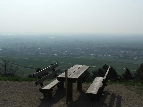 Lage einige Ruhebänke mit Blick über Deidesheim und die Rheinebene bis