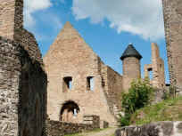 viereckige Bergfried (als Aussichtsturm zugänglich), die Außenmauer, die Burgtore