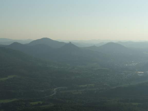 nach Westen über Annweiler und den Trifels weit in den Wasgau; im Osten